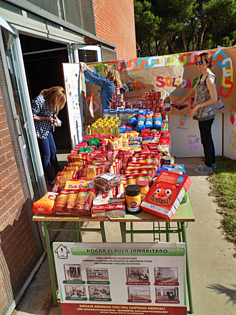 Podemos entender como SOLIDARIDAD el sentimiento de adhesión o apoyo incondicional de un grupo o colectivo con objetivos comunes, y que trabajan unidos para lograrlos, en beneficio de intereses o necesidades ajenas especialmente en situaciones difíciles o comprometidas.La “3ª Cadena Solidaria” que la Comisión de la Salud organizó el jueves 28 de mayo fue el colofón de la acción solidaria que nuestro centro ha mantenido durante todo el curso. La cadena en sí, es decir, el hecho físico de transportar los alimentos que se recogieron previamente, fue el final, un acto solidario también, pero no olvidemos que este día se pudieron entregar más de 300 kilos de alimentos porque muchas personas pusieron su esfuerzo al servicio de esta causa con aportaciones económicas y en especies, gestiones, idas y venidas y hasta su esfuerzo físico (acordaros de la Carrera Solidaria) durante muchos meses, sin actos visibles, sin noticias sobre ello y sin fotos.